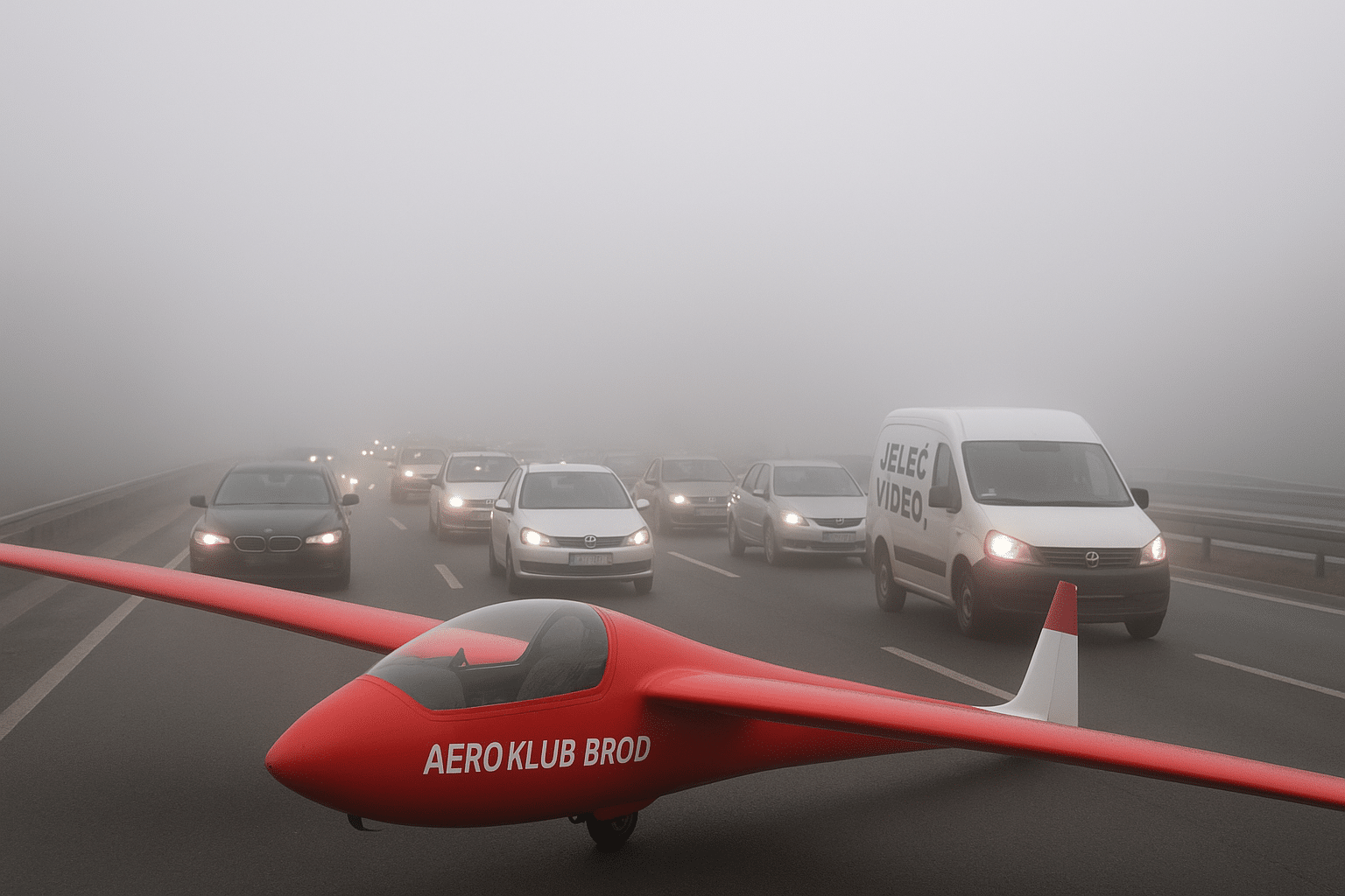 Slavonski Brod ponovno je obavijen tradicionalnim zimskim tepihom magle koju ni Viagra ne može dići.Toliko guste da se jedino vidi kako vremenska prognoza odustaje i sama od sebe,, ali magla ostaje. Na aerodromu Zračna luka Jelas situacija je postala toliko ozbiljna da su jedrilice Aerokluba BROD već tri dana zaredom sigurne samo u to da neće nikamo. Pilotima je dosadilo brojat molekule vlage, pa je klub nakon dugog sastanka upravnih tijela(koji je trajao sve dok se magla nije umorila slušati) odlučio uvesti rješenje koje u normalnim zemljama ne bi palo na pamet nikome tko je prošao liječnički pregled.