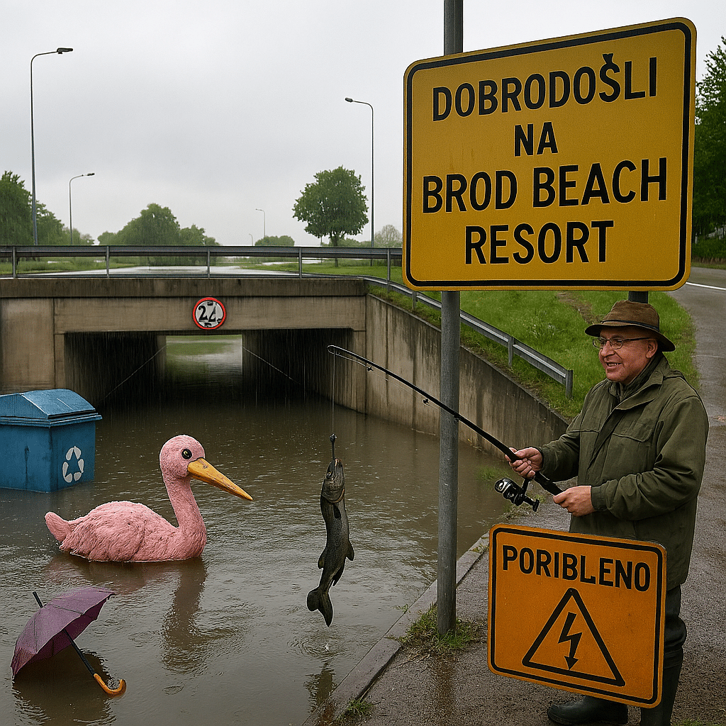 Slavonski Brod ovih dana ne prestaje iznenađivati. Nakon kiše koja je pala s tolikom odlučnošću da bi i tropske prašume zavidjele, grad je doživio transformaciju kakvu ni najluđi urbanistički planeri ne bi mogli zamisliti. Podvožnjak u Kumičićevoj ulici, nekad suha prometna točka, sada je službeno proglašen prvim javnim kupalištem s prirodnim punjenjem. Gradska uprava, u duhu poduzetnosti i rada za opće dobro, održala je izvanrednu sjednicu i odlučila – kupanje se naplaćuje! Cijene su, kažu, prigodne, s blagim povećanjem u odnosu na lokalni bazen, jer voda u podvožnjaku dolazi direktno iz oblaka, bez kemikalija i s dodatkom adrenalina. Pored je i Kaufland i Lidl, pa možete i konzumirati što želite. Nisu ni Šefki , kao ni MC Donallds daleko stoji u priopčenju grada uz preporuku da sami birate nakon divljenja svim radovima koji su obaljeni u našem gradu po visokim standardima kvalitete. Naravno ako Vam bude dobro od postojane kvantitete i kvalitete. Imamo i video punjenja bazena. Što je je, brzo se puni.