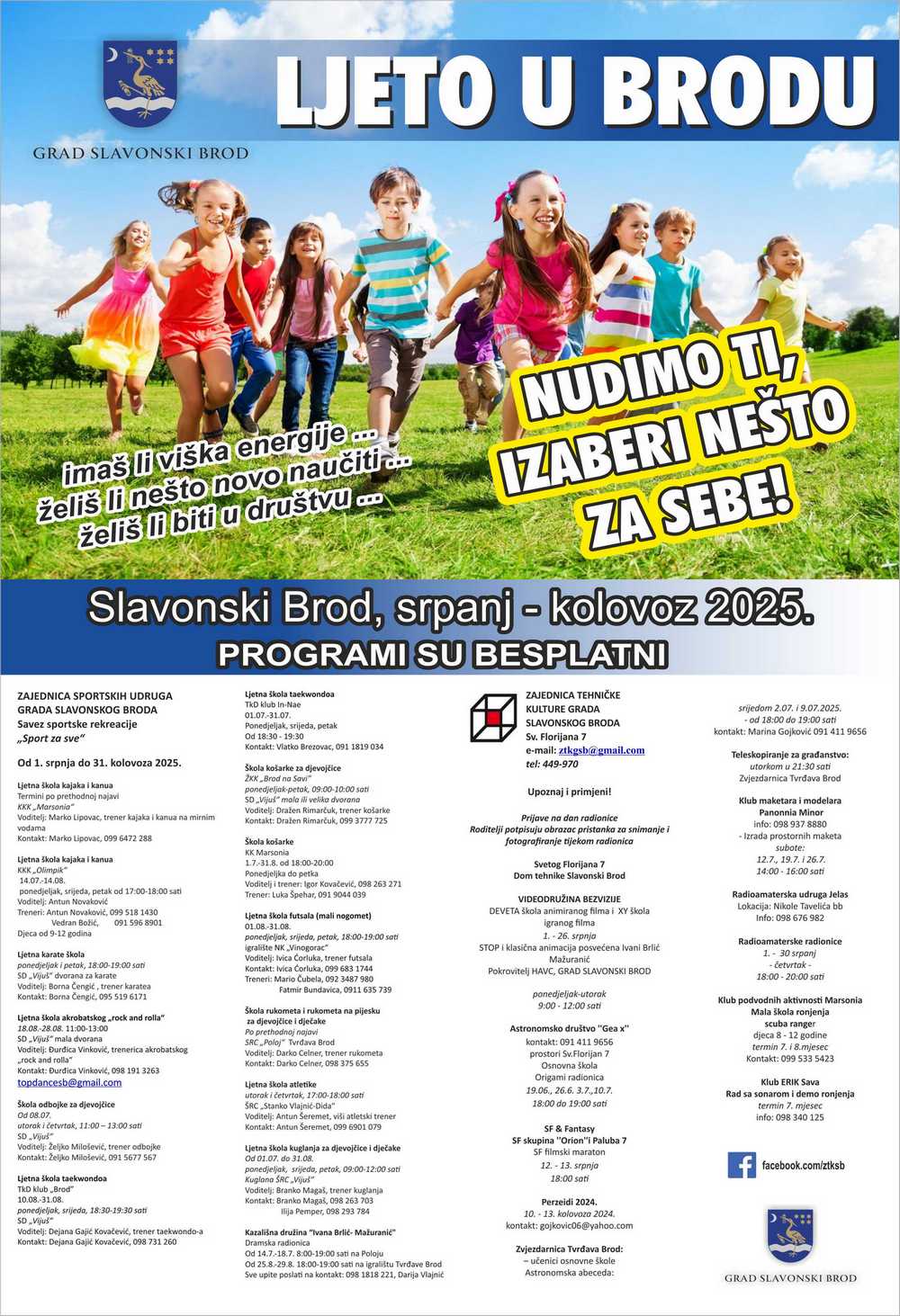 I ovog ljeta Grad Slavonski Brod, u suradnji sa Zajednicom sportskih udruga, Zajednicom tehničke kulture i brojnim klubovima, pripremio je bogat i raznovrstan program aktivnosti za sve školarce tijekom srpnja i kolovoza.