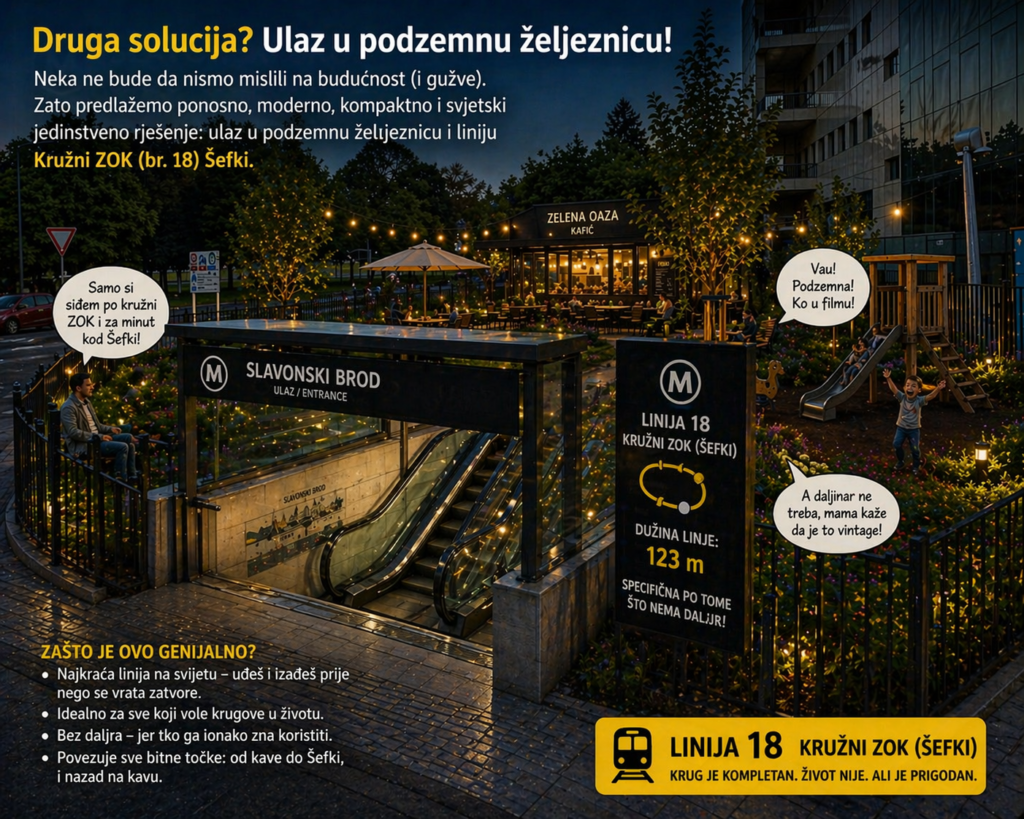 Naravno, postoji i druga – nimalo skromna, ali potpuno razumno nerazumna opcija: na tom istom ćošku napraviti ulaz u podzemnu željeznicu Slavonski Brod. Jer ako već imamo izravnano zemljište bivše ruševine, zašto ne bismo imali i metro? I to ne bilo kakav – nego ekskluzivnu liniju Kružni ZOK (br. 18)-Šefki, tehnološko čudo dužine čak 123 metra. Da, dobro ste pročitali taman toliko da uđeš, sjedneš, i već moraš izlaziti jer si stigao… nigdje dalje, ali ako pojedeš ćevape puste te u Pilarevu. Linija je, naravno, kružna, što znači da se nikad ne izgubiš, ali ni ne napreduješ idealna metafora života i Slavonskog Broda Posebna zanimljivost? Nema daljina. Jer tko još danas ima vremena za gledanje koliko još ima stanica – ovdje je svaka stanica “tu negdje”. Savršeno za sve koji žele osjetiti čari velikog grada, ali bez naporne logistike i, ne daj Bože, stvarnog putovanja.